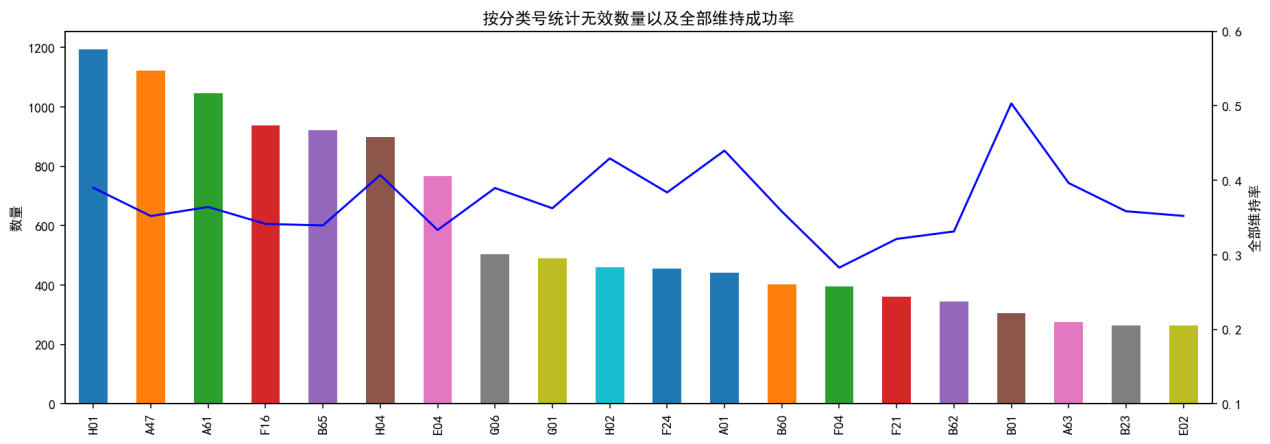 上图为按分类号(仅取每个案件的前三位)统计的无效宣告请求案件数量以及其中全部维持决定的占比。从图中可以看出,H01(基本电气元件)、A47(家具;家庭用的物品或设备;咖啡磨;香料磨;一般吸尘器)、A61(医学或兽医学;卫生学)这三类的无效宣告请求案件数量最多,均超过1000件。