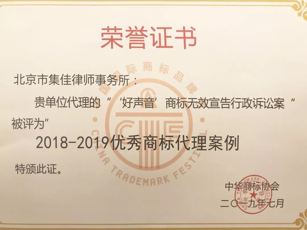 >开云>关于我们>荣誉概览>2019>集佳代理“好声音”商标无效宣告行政案入选“优秀商标代理案例”